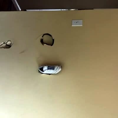 A woman kicks a hole in a wall at home, but her shoe gets stuck in the wall, and she falls down. Video displayed sideways.