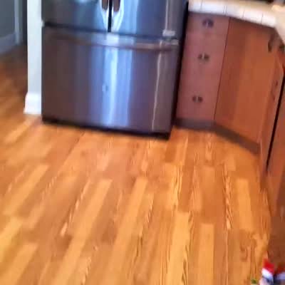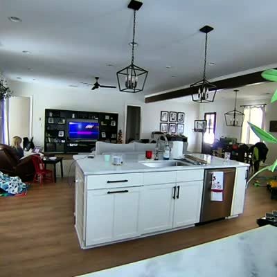 A man's foot breaks through a hole in the kitchen ceiling while a woman talks on the phone. Security footage.