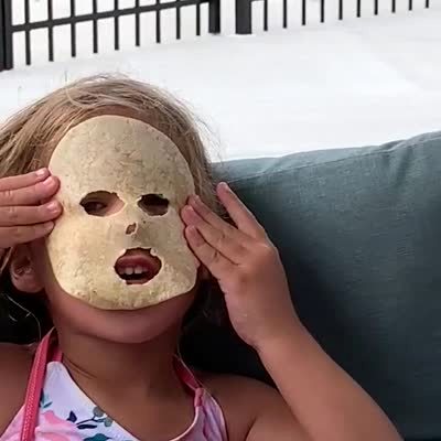 A young girl asks Alfonso for more food videos with her face through the holes of tortilla in the yard.