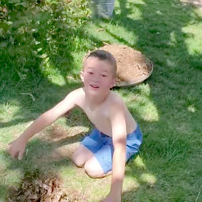 A young boy leans his head into a hole in the yard to look for a leaky pipe. Then it sprays him with water, and he yells that he found it.