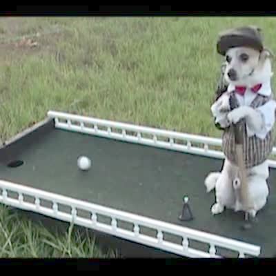 Small white dog wears a golf outfit & hits a golf ball into a specially made hole built into the platform the dog is standing on. He also drives a little golf cart and wears a golf outfit.