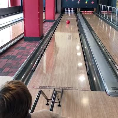 A young boy bowls a ball at a bowling alley and knocks down all of the pins. Then he yells "yeah, hole in one!"