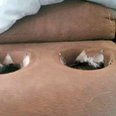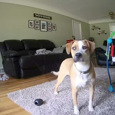 A dog bites at a hole in a living room couch, then he turns around and stares when a woman yells at him through a security camera. He looks into the camera and smells it. Security footage.