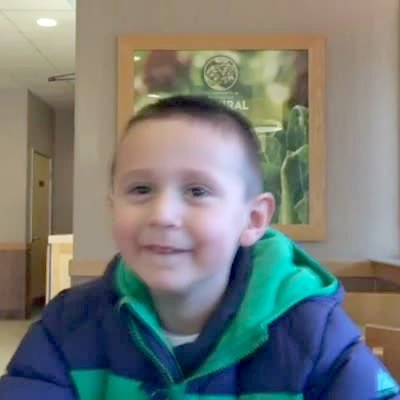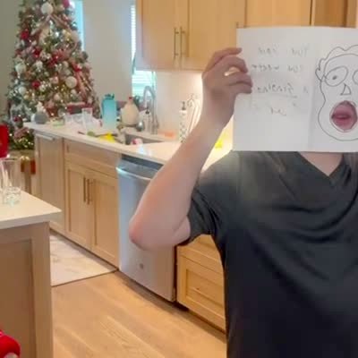 A young boy tells a senior woman in a kitchen that he made her a card that sings. He opens the card to show that there is a hole cut out of it, then he puts his face in the hole and sings "Happy Birthday" and then "We Wish You A Merry Christmas."