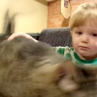 A tot boy pets a cat on a couch. He tells the cat that there is nothing to be afraid of. Then the tot looks at the cat's rear and says, "That's a butt hole. You don't want to touch that."