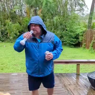 A man pretends to be a reporter while Hurricane Ian blows through his backyard. He then steps on and breaks a hole in the patio deck. His leg goes through a plank and he gets stuck and falls backwards.