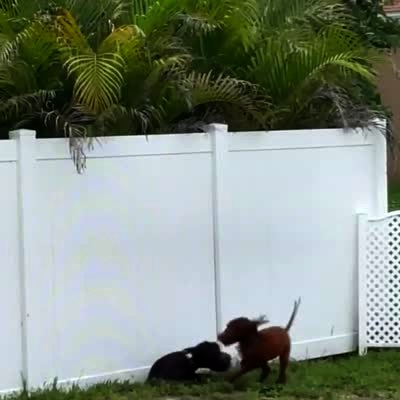 Two Poodle dogs crawl out from a hole underneath a fence and run into the neighbor's yard.