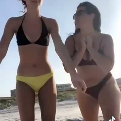Two women dance along to a song on a beach, then one woman backs into a hole in the sand. TikTok.