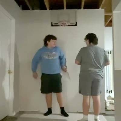 Two young boys play with an indoor game of basketball and the boy with the ball bumps the other boy and that boy falls into a wall and puts a hole in the wall and says "Jacob, you slammed me into it," and there is a pause and the boy with the ball dunks the ball through the net and then starts to laugh.