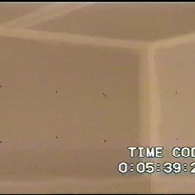 A man falls through a house's ceiling while he works in an attic and causes insulation to fall on the living room floor. Security footage.