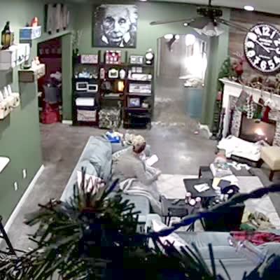Home security camera footage of a woman who sits in the living room and then gets scared when part of the ceiling collapses and her husband's leg falls through.