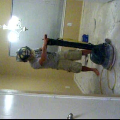 Safety video for wearing stilts while dry walling. Man falls hard (with recovery)