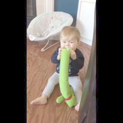 A tot boy chews on a toy. When his mom tells him that it is the dog's toy, he yells, throws the toy in the air and looks shocked.