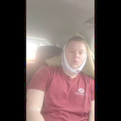 A teen boy and teen girl, recovering from dental surgery, ride in a car and talk about ice cream. The gauze fall out of the teen boy's mouth and he screams in horror because he thinks that it is his tongue.