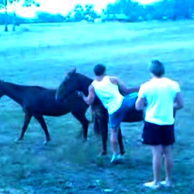 A man tries to climb onto the back on a horse. The horse runs off and the man falls off the back of the horse onto the ground. Two other men laugh at him. Jerky camera.
