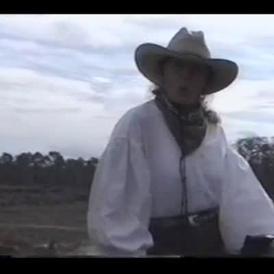 Senior woman on horse tries to dismount onto man's shoulders. They both fall down. . "That was what you call a rough dismount."