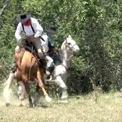 Man and woman make a snowman shape out of horse poop. Then man rides by on horse and destroys it with a lasso. Cowboy