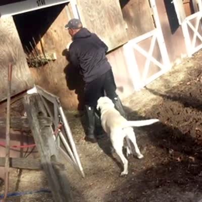 Middle aged man rides a horse in a field. The horse is scared by a lab dog and bucks the man off.