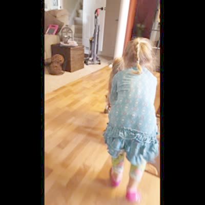 A young girl rides a rocking horse and repeatedly says "I gotta slow down, Poppy slow down," but she does not slow down and eventually she just falls off.