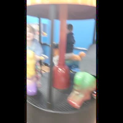 A young girl rides a merry go round and says cheese, then a young boy circles through, then another boy who has his head down on his horse.