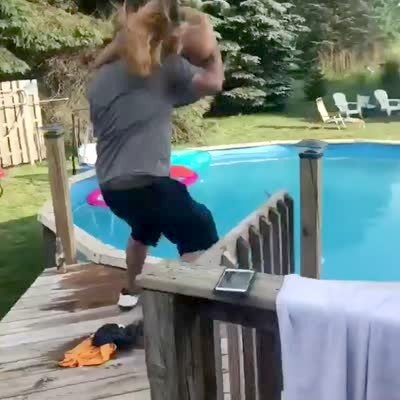 A man tries to throw a teen girl into a pool but he trips and falls in along with her.