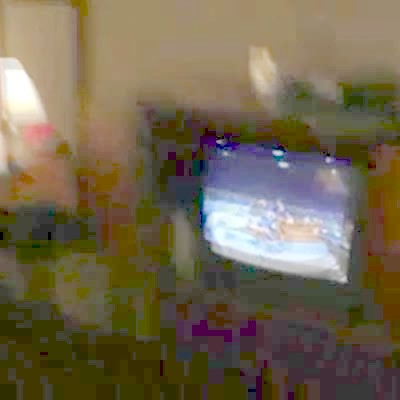 A woman lifts a Styrofoam bowl and runs away when a cockroach runs out from underneath in a hotel room.