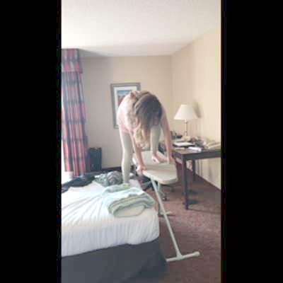 A teen girl stands on an ironing board then the board kicks out and she falls on her butt and hits her head against the wall.