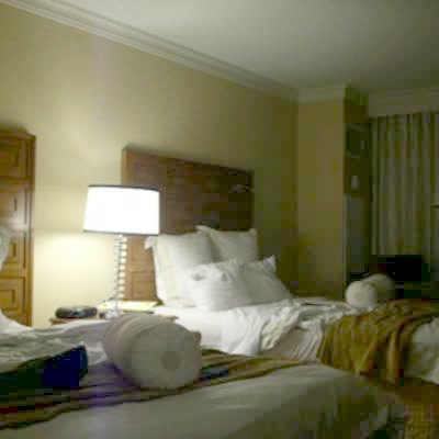 A man interviews their kids in their hotel room at Disney but they are passed out cold on a bed together.