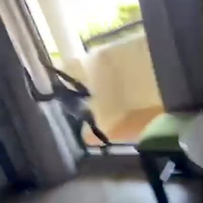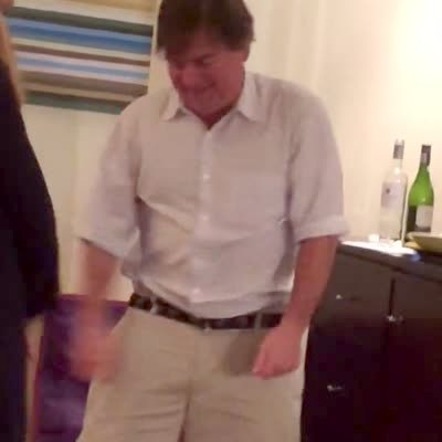 A man stands on a hotel room balcony wearing a speedo bathing suit and high heels. He tries to do a catwalk into the room to music, but trips and falls. Music rights not cleared.