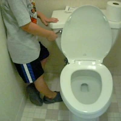 Young girl says she paid extra money to have a talking toilet in their hotel room. Boy flushes the toilet and it makes strange noises. Bathroom.