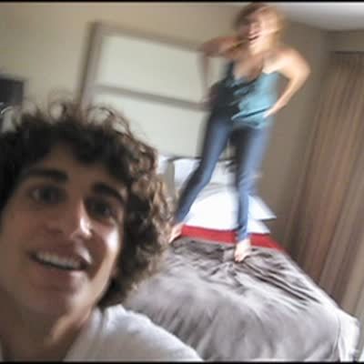 Teen girl jumps on bed in hotel room. Teen boy joins her and hits his head