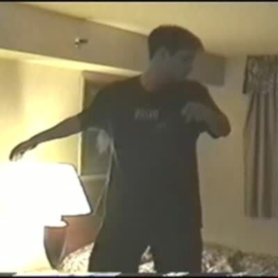 Young man does back flips from one hotel bed to another. He says "this will be the best one yet" & falls in between the 2 beds. Bonehead.