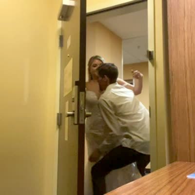 A man attempts to carry a bride over a threshold. He is not able to do it before the door closes. The door to the hotel room shuts with his key still inside the room.