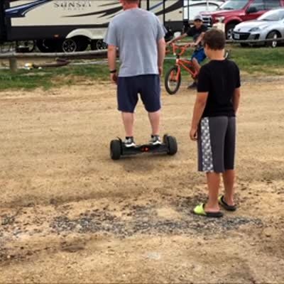 A young boy warns his uncle man about the speed he rides the hover board then then the man speeds on it and loses his balance and falls on his back. The young boy checks on the hover board then kicks his uncle.