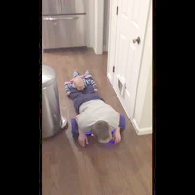 A baby boy rides on the legs of his young brother as they lay on a hover board.