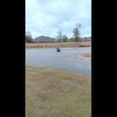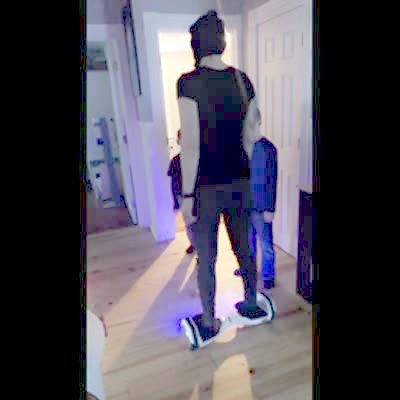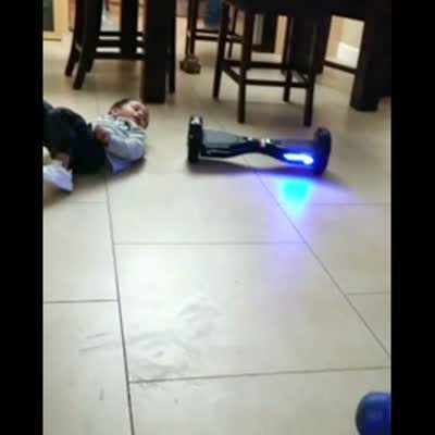 A young boy records himself as he teaches how to ride a hoverboard, but he falls off and it rolls away out of frame as he chases it. He rolls back into frame, says "it rolled away," and then tries again but the same thing happens.