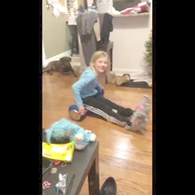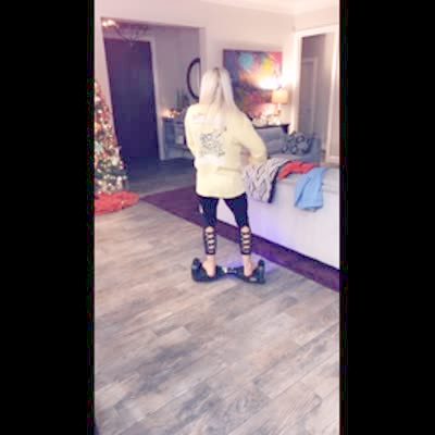 A girl demonstrates how to use a hover board with the driving attachment in the house. She falls backwards and rolls into the backdoor. The hover board then rolls away by itself and crashes into a Christmas tree off camera. An ornament rolls across the floor. A woman yells at her. TikTok