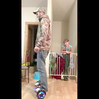A dad rides a hover board through his house, and his young girl daughter watches. She says he is amazing, and then he immediately loses his balance, and falls down.
