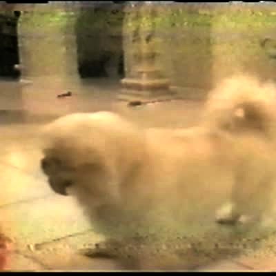 A dog with an absurdly long tongue tries to eat ice cream indoors. He has "hanging tongue syndrome".