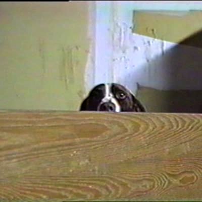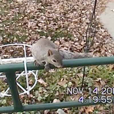 A squirrel crawls around a porch on a railing. Then it jumps on the camera. (2103)