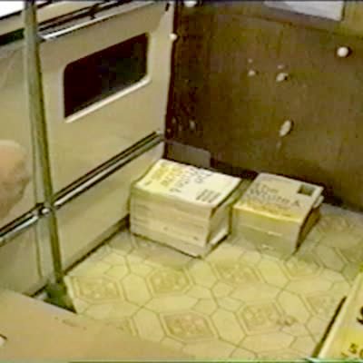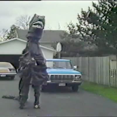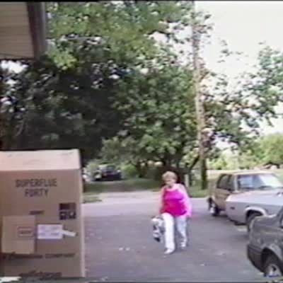 AA: Surprise. Man in box scares people (lady in red & lady in white)