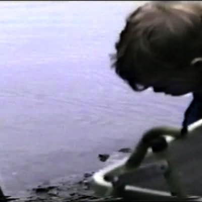 A young boy and his father fish in a lake. The child reels in the line, and his father tries to help him. Then, his father slips and falls into the lake.