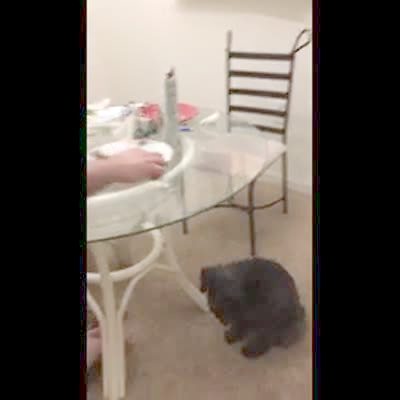 A Boston Terrier dog paws and struggles to reach a piece of Cheerios cereal on a table. He finally gets it, but then tries to lick it and it moves away from him.
