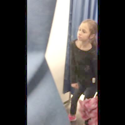 A young girl dances in a dressing room stall. Her mom tells her to hurry up and she yelps.