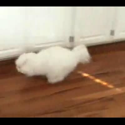 "Furry In A Hurry" White fluffy cat gets scared / startled by kitchen timer going off. It dings, cat can't run away fast enough - skids on the hardwood floor like a cartoon