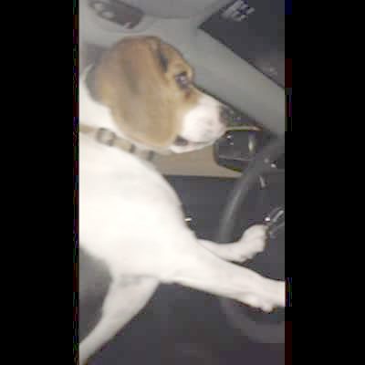 A Beagle dog honks the horn of a car to encourage his owner to hurry back.
