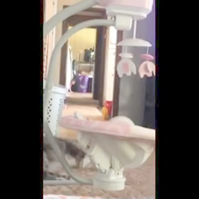 A man kicks a ball to a cat which grabs it and accidentally tackles a baby boy who is sitting on the floor while trying to retrieve it. Security footage.