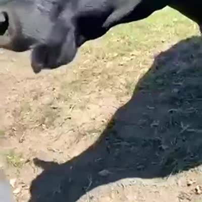 A woman feeds cows apples then a cow sneezes on her arm and she runs away and says, "It sneezed on me" on the farm.