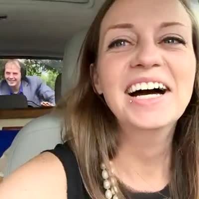 A woman in the passenger seat of a car holds a baby cow on her lap. The calf pees on her and the woman tells the driver to hurry up. Music rights not cleared.