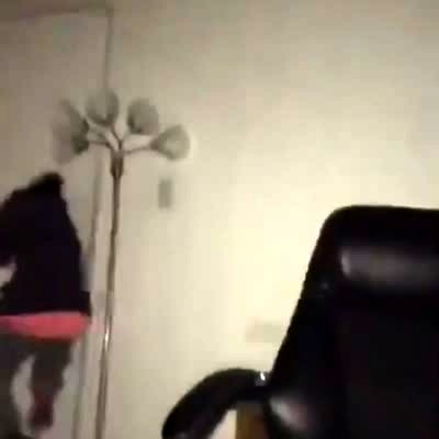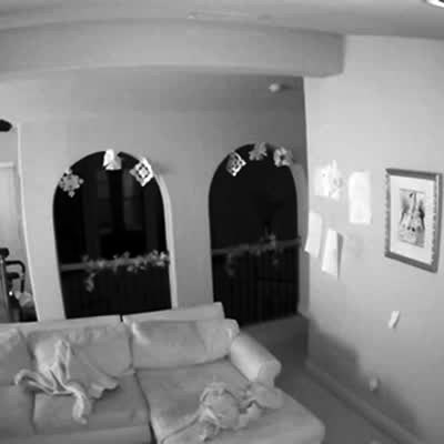 A young boy walks into the living room at night and his dad talks through the security camera, asking him to go back to bed. The boy gets scared, screams and runs back into his room. Security footage.